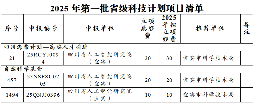 近日,四川省科技厅对2025年第一批省级科技计划项目进行了公示,四川省人工智能研究院(宜宾)蒋春林博士、徐黎明博士和曾鹏鹏博士申报的3项项目成功获批立项(具体清