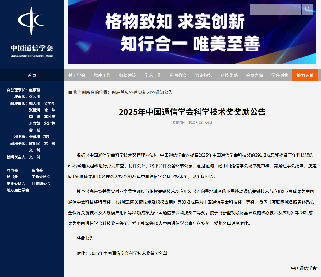 研究院院长曹晟获2025年中国通信学会科学技术奖一等奖